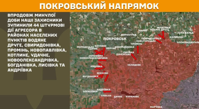 За даними Генштабу ЗСУ, за останню добу росіяни здійснили 44 атаки, зосередивши свої зусилля поблизу таких населених пунктів, як Водяне Друге, Свиридівка, Промінь, Котлине, Удачне, Новоолександрівка, Богданівка, Лисівка, Андріївка та Новопавлівка.