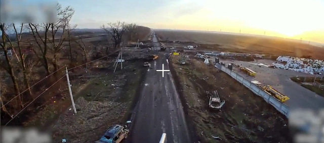 Пошкоджена дорога, яка виконує важливу роль у забезпеченні українських військових, вкрита уламками техніки, що демонструє напруженість і інтенсивність боїв у цьому районі.