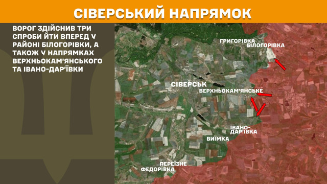 На Сіверському напрямку противник здійснив три спроби прориву в районі Білогорівки, а також у Верхньокам'янському та Івано-Дар'ївці.