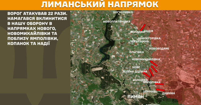 За оперативними даними Генштабу ЗСУ, на ранок, 21 березня, на Лиманському напрямку зафіксовано 22 атаки окупантів в напрямках Нового, Новомихайлівки і поблизу Ямполовки, Копанок та Надії.