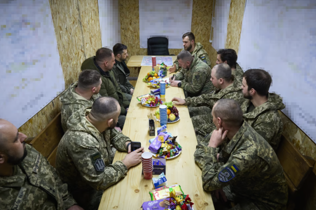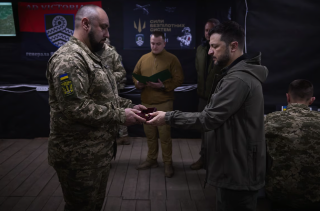 Президент України Володимир Зеленський відвідав командний пункт 59-ї окремої штурмової бригади безпілотних систем ім. Якова Гандзюка. В ході візиту він заслухав доповідь про поточну ситуацію на фронті та удостоїв воїнів державними нагородами.
