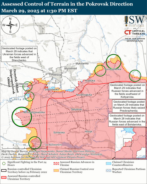 У той же час, за даними за 28 і 29 березня, українські захисники показали відновлення позицій під Покровськом в районі Шевченко, хоча російська армія продовжує штурмувати цей напрямок, використовуючи бронетехніку.