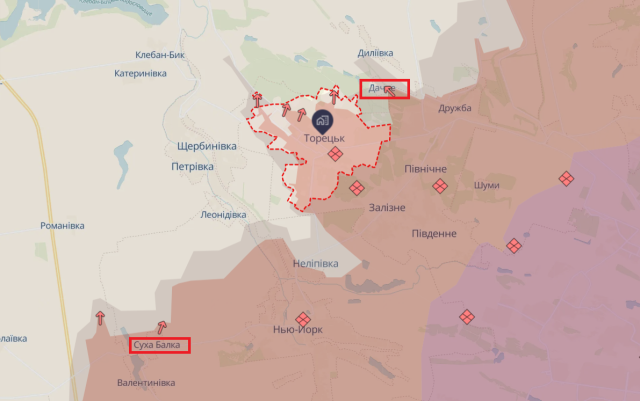 Згідно з даними аналітиків «DeepState», 29 квітня російська армія істотно просунулася. Окупанти захопили селище Суха Балка та посилили свої позиції в Торецьку та районі селища Дачне.
