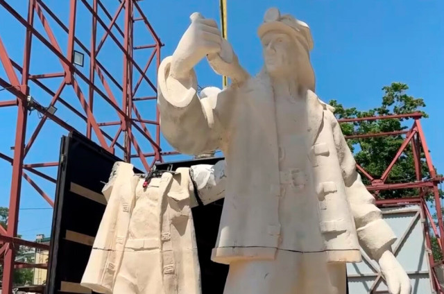 Роботи виконують майстри з Ростова-на-Дону на замовлення Санкт-Петербурга. Згідно з заявами окупаційної влади, реконструкція театру триває на старому фундаменті, а завершення будівництва заплановане на 2025 рік. Водночас скульптурну композицію обіцяють встановити вже до кінця червня цього року.