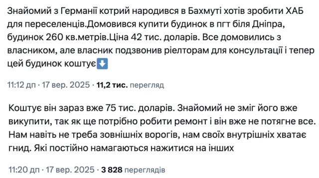 За інформацією джерела, чоловік домовився придбати будинок площею 260 квадратних метрів у селищі поблизу Дніпра за 42 тисячі доларів. Втім, після консультації власника з рієлторами ціна різко зросла до 75 тисяч доларів.
