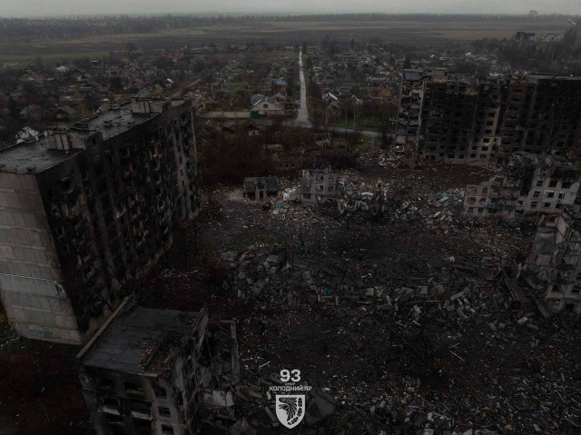 На фото видно значні руйнування житлових будинків, пошкоджену інфраструктуру та наслідки тривалих бойових дій у різних районах міста.