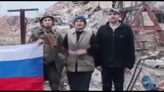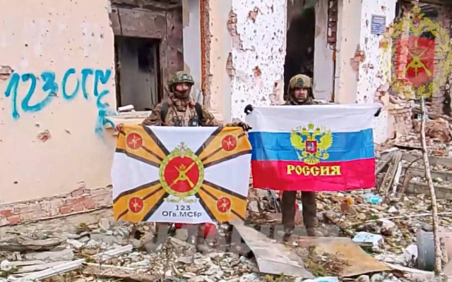 На оприлюднених окупантами кадрах видно російських військових із триколорами на фоні зруйнованого міста.